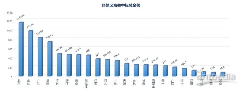 在采購金額方面,北京、山東和廣東依舊名列前茅,中標(biāo)金額分別達到1150.88萬元、973.68萬元和826.98萬元,福建和江蘇也表現(xiàn)突出,中標(biāo)金額為739.52萬元和 480.88萬元。排名前五的地區(qū),其中標(biāo)金額之和占據(jù)了總中標(biāo)金額的近50%。同時也可以看出,中標(biāo)金額與中標(biāo)數(shù)量密切相關(guān)。