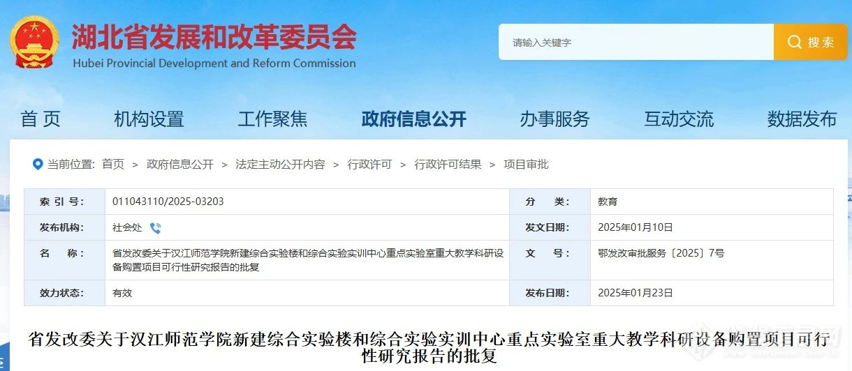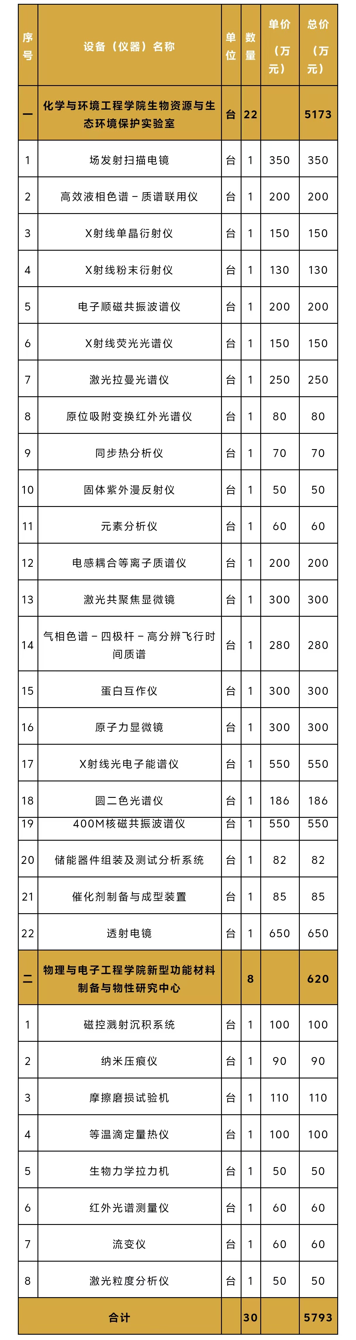 日前,湖北省發(fā)展和改革委員會(huì)發(fā)布了《關(guān)于漢江師范學(xué)院新建綜合實(shí)驗(yàn)樓和綜合實(shí)驗(yàn)實(shí)訓(xùn)中心重點(diǎn)實(shí)驗(yàn)室重大教學(xué)科研設(shè)備購置項(xiàng)目可行性研究報(bào)告的批復(fù)》。該項(xiàng)目總投資5793萬元,用于重大科研儀器設(shè)備購置,資金來源為除爭取中央投資外,其余由學(xué)校自籌解決。擬更新設(shè)備共30臺(tái)(套)【清單表附表】,其中化學(xué)與環(huán)境工程學(xué)院生物資源與生態(tài)環(huán)境保護(hù)實(shí)驗(yàn)室更新設(shè)備22臺(tái)(套)、物理與電子工程學(xué)院新型功能材料制備與物性研究中心更新設(shè)備8臺(tái)(套)。淘汰同品目設(shè)備38臺(tái)(套)。
