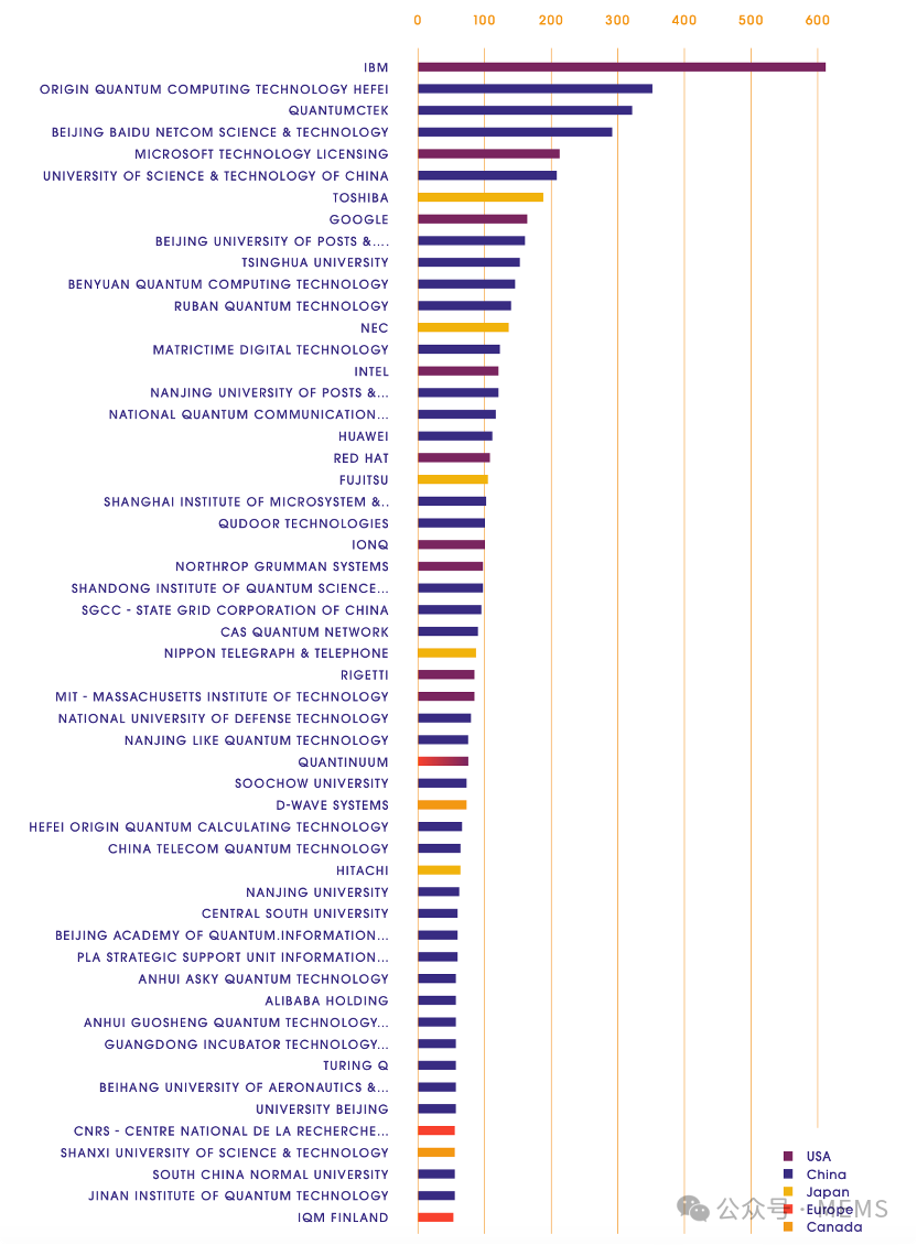 在中國申請的量子技術專利按申請量排名,前25位專利申請人中,除了三家來自美國的申請人(IBM、谷歌和微軟),其他全部為中國本土機構,包括本源量子計算科技(合肥)股份有限公司、北京百度網(wǎng)訊科技有限公司、科大國盾量子技術股份有限公司、如班量子科技有限公司、中國科學技術大學、清華大學、北京郵電大學及南京郵電大學等。