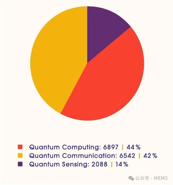 2024年,量子計算和量子通信領域的專利族占比明顯高于量子傳感,三者的占比分別為44%、42%和14%。從2023年~2024年的增長率來看,量子計算和量子通信領域的專利增長也顯著高于量子傳感領域,三者的增長率分別為37%、22%和3%。反映了當前全球量子技術領域的發(fā)展熱點和重點方向。