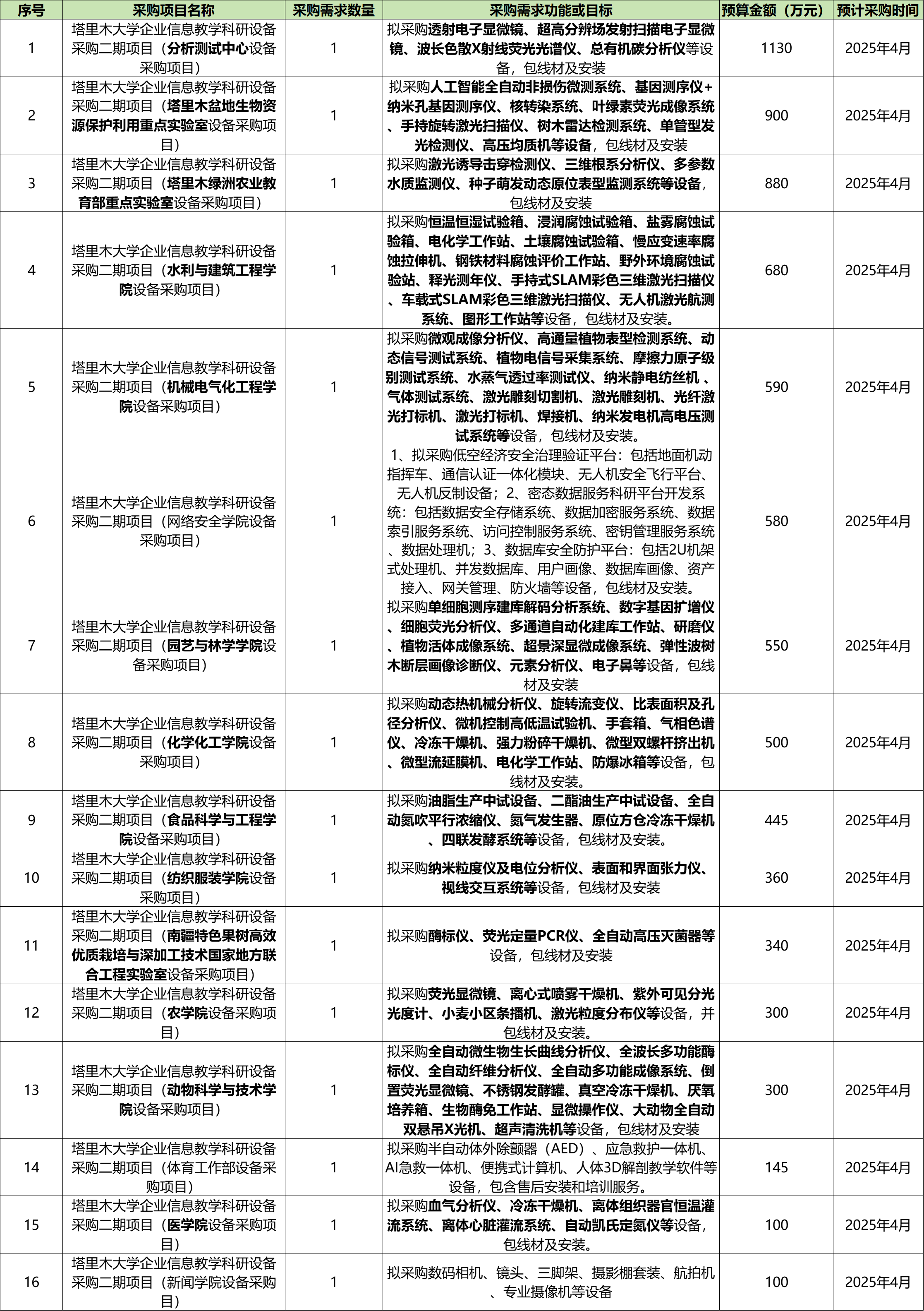 為便于供應(yīng)商及時了解政府采購信息,根據(jù)《財政部關(guān)于開展政府采購意向公開工作的通知》(財庫〔2020〕10號)等有關(guān)規(guī)定,現(xiàn)將塔里木大學(xué)2025年3月第三批采購意向公開如下: