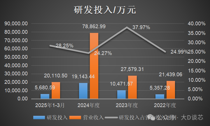 2022年至2025年3月,公司研發(fā)費(fèi)用金額分別為5,357.28萬元、10,471.57萬元、19,143.44萬元和5,680.59萬元,占營業(yè)收入的比例分別為24.99%、37.97%、24.27%和28.25%,