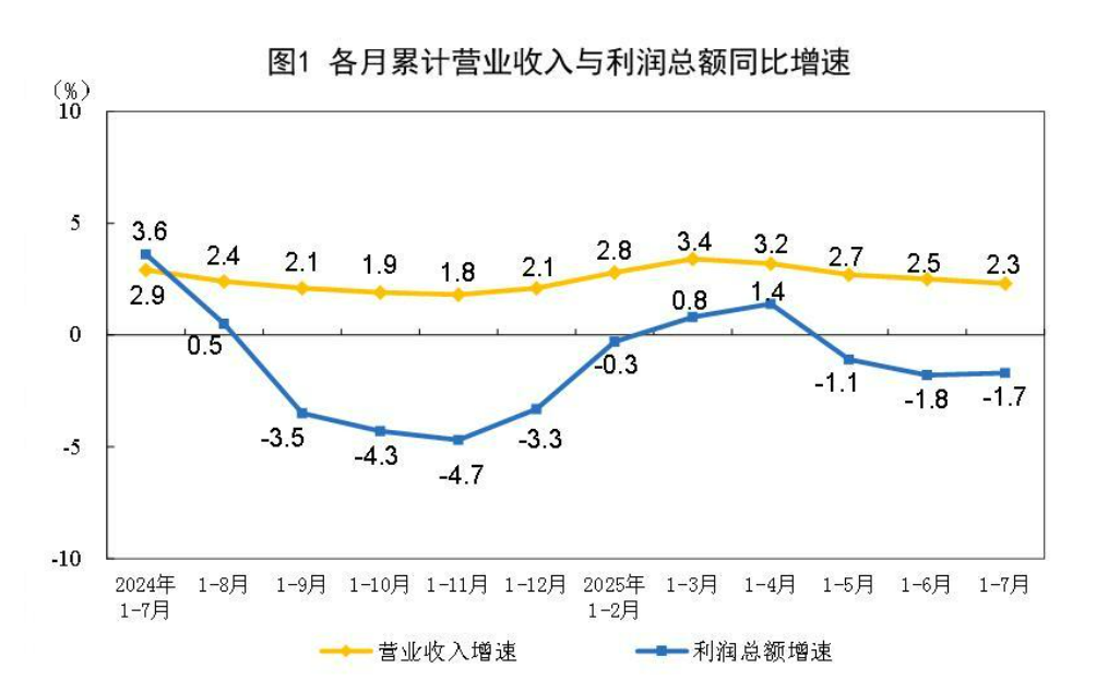 1—7月份,全國規模以上工業企業實現利潤總額40203.5億元,同比下降1.7%(按可比口徑計算,詳見附注二)。