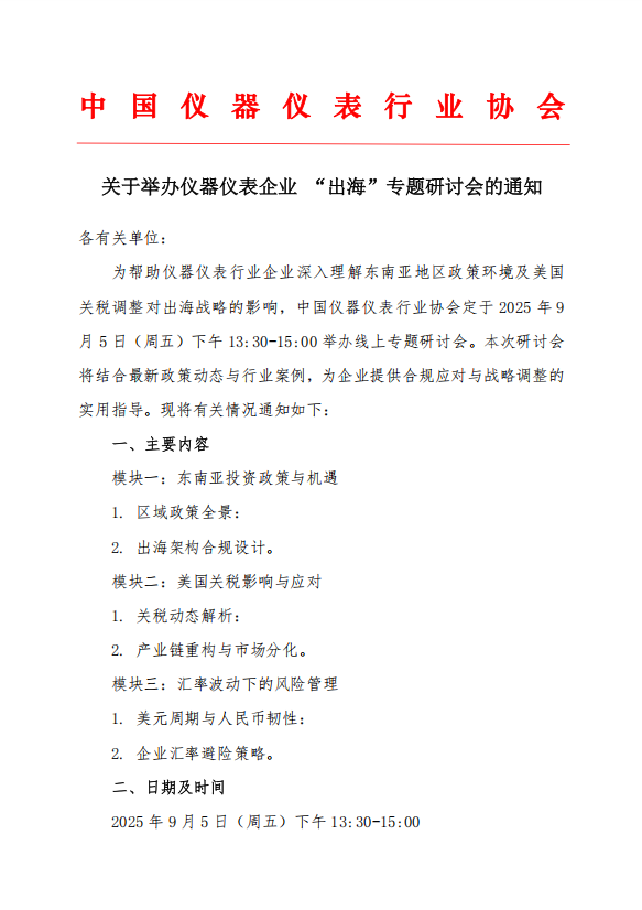 關于舉辦儀器儀表企業 “出海”專題研討會的通知