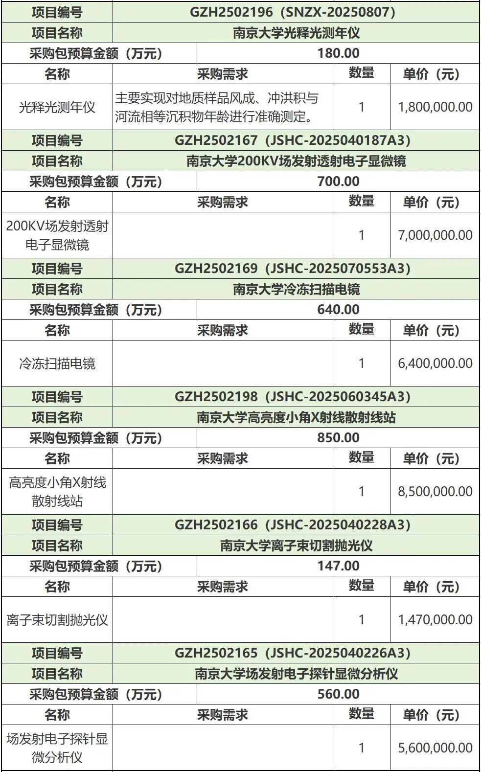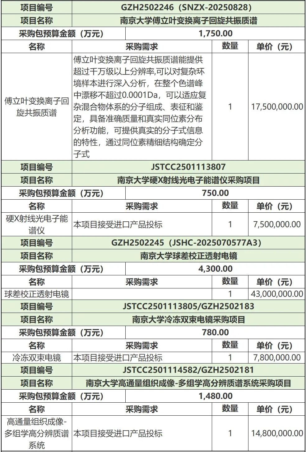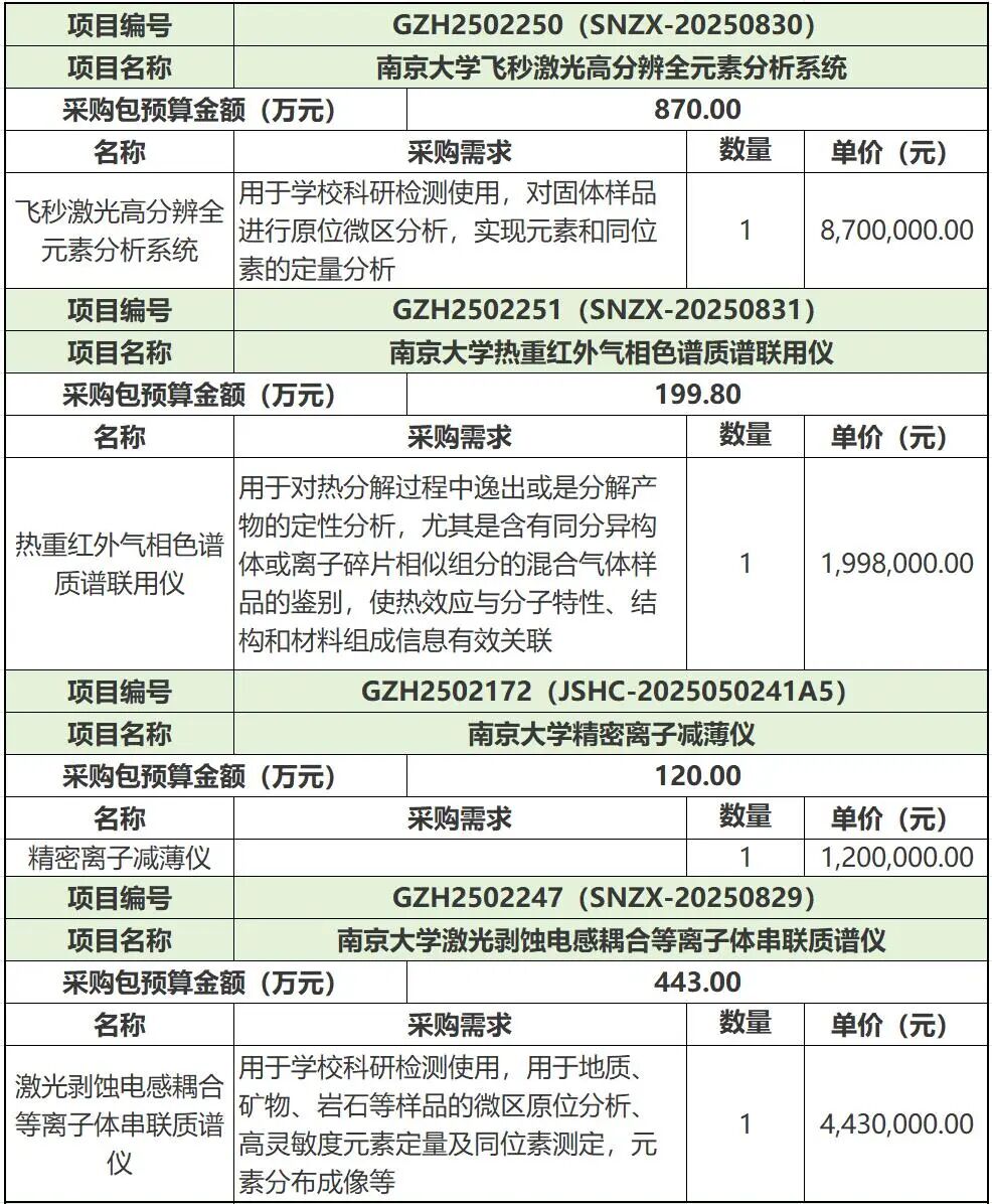 近日,南京大學多個科研儀器設備招標項目發布,采購包括激光剝蝕電感耦合等離子體串聯質譜儀、球差校正透射電鏡、冷凍雙束電鏡、飛秒激光高分辨全元素分析系統,熱重紅外氣相色譜質譜聯用儀、傅立葉變換離子回旋共振質譜、硬X射線光電子能譜儀、高通量組織成像-多組學高分辨質譜系統、場發射電子探針顯微分析儀、顯微紅外光譜儀等,總采購金額超1.45億元。