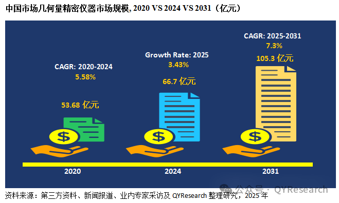 幾何量精密儀器是指用于測量物體長度、角度、形狀、位置、輪廓、形位誤差等幾何參數的高精度測量設備,是計量測試領域的基礎儀器之一,在工業生產、國家計量等領域具有重要作用。根據研究團隊調研統計,中國市場在過去幾年變化較快,2024年中國幾何量精密儀器市場銷售額達到了66.7億元,預計2031年將達到105.3億元,年復合增長率(CAGR)為7.3%(2025-2031)。