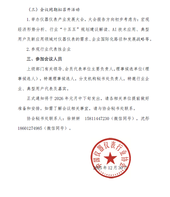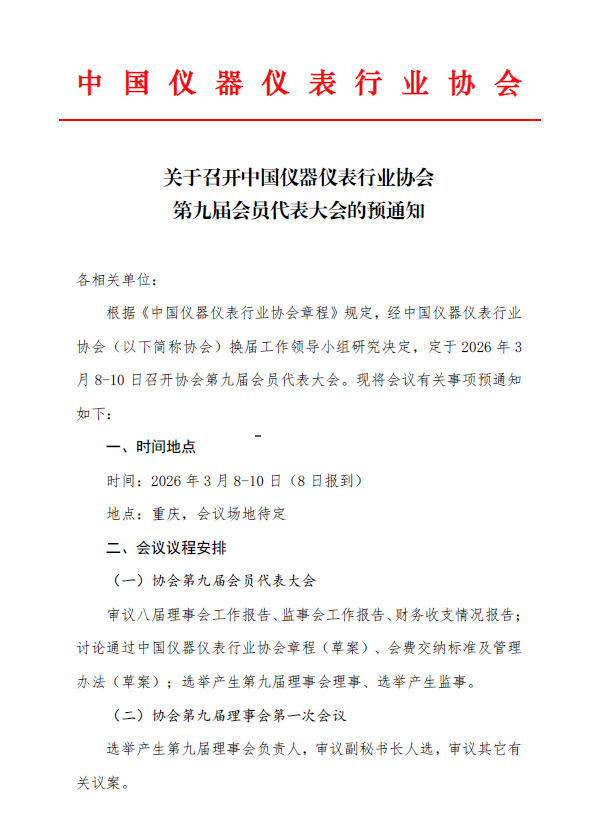 根據(jù)《中國儀器儀表行業(yè)協(xié)會章程》規(guī)定,經(jīng)中國儀器儀表行業(yè)協(xié)會(以下簡稱協(xié)會)換屆工作領(lǐng)導(dǎo)小組研究決定,定于2026 年3月8-10 日召開協(xié)會第九屆會員代表大會。現(xiàn)將會議有關(guān)事項(xiàng)預(yù)通知如下: