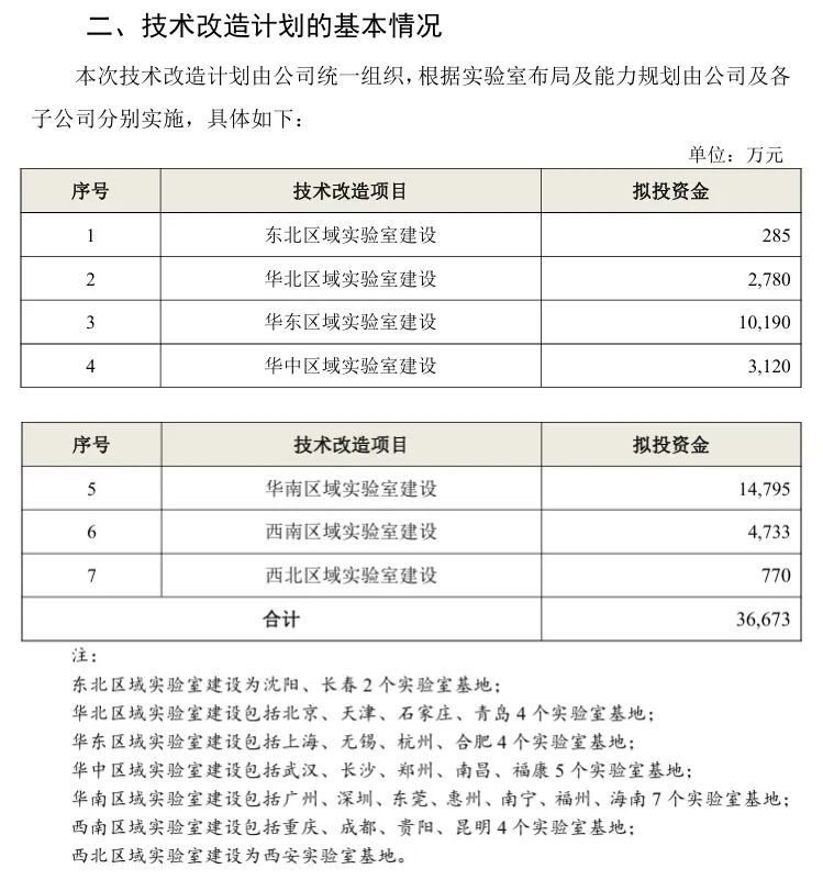 本次技術(shù)改造計劃由公司統(tǒng)一組織,根據(jù)實驗室布局及能力規(guī)劃由公司及各子公司分別實施,在全國七大區(qū)域(東北、華北、華東、華中、華南、西南、西北)的合計27個實驗室基地分別實施。