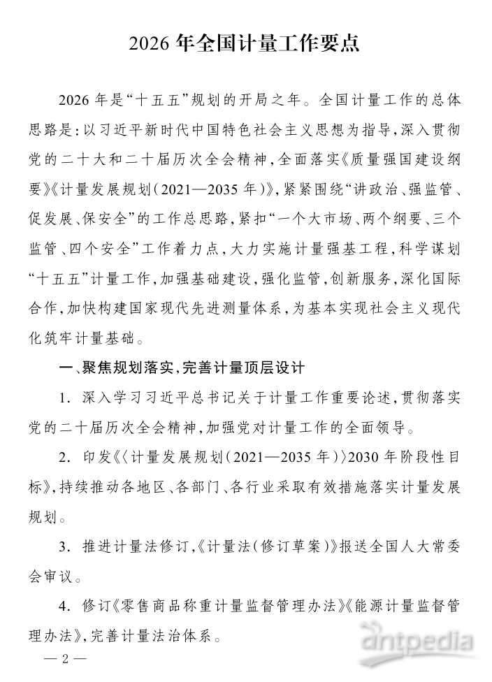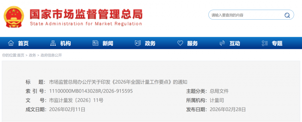 近日,市場監(jiān)管總局印發(fā)《2026年全國計(jì)量工作要點(diǎn)》,明確2026年將緊緊圍繞“講政治、強(qiáng)監(jiān)管、促發(fā)展、保安全”的工作總思路,緊扣“一個(gè)大市場、兩個(gè)綱要、三個(gè)監(jiān)管、四個(gè)安全”工作著力點(diǎn),大力實(shí)施計(jì)量強(qiáng)基工程,科學(xué)謀劃“十五五”計(jì)量工作,加強(qiáng)基礎(chǔ)建設(shè),強(qiáng)化監(jiān)管,創(chuàng)新服務(wù),深化國際合作,加快構(gòu)建國家現(xiàn)代先進(jìn)測量體系,為基本實(shí)現(xiàn)社會主義現(xiàn)代化筑牢計(jì)量基礎(chǔ)。