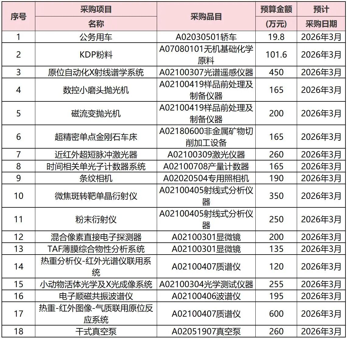 本次采購項目涵蓋光譜儀、衍射儀、質譜儀、波譜儀、激光器、精密加工設備、電子探測器、成像系統等。