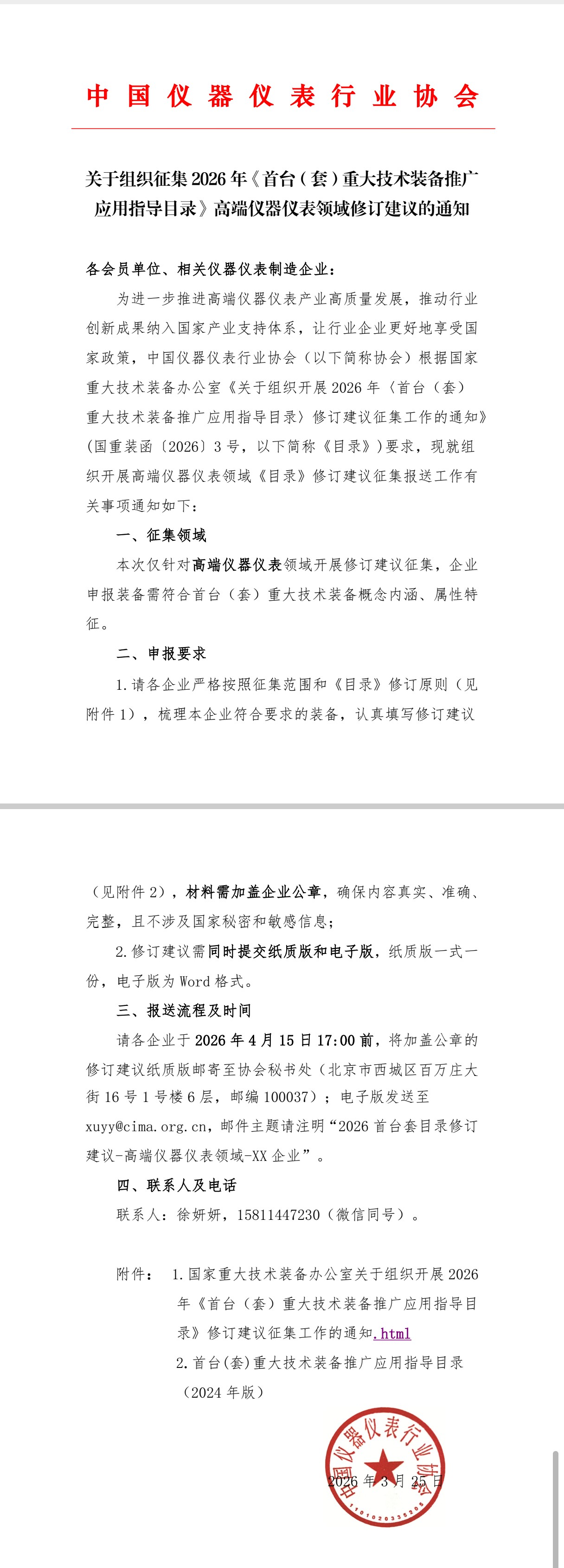 1. 國家重大技術(shù)裝備辦公室關(guān)于組織開展 2026 年《首臺(套)重大技術(shù)裝備推廣應(yīng)用指導(dǎo)目錄》修訂建議征集工作的通知