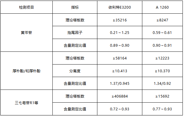 驗評參照《中國藥典》及相關藥品、食品檢驗標準方法,包括:(1)黃芩苷、厚樸酚與和厚樸酚、三七皂苷等中藥材成分的測定方法;(2)實際樣品測試中直接與某品牌1260 HPLC進行平行比對。