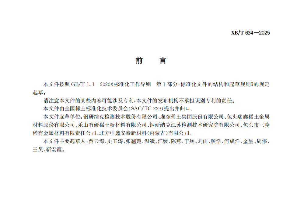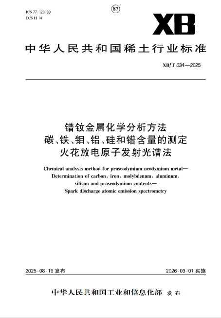 由鋼研納克檢測(cè)技術(shù)股份有限公司(以下簡(jiǎn)稱“鋼研納克”)牽頭,鋼研納克江蘇檢測(cè)技術(shù)研究院有限公司參與,聯(lián)合多家行業(yè)重點(diǎn)稀土金屬生產(chǎn)企業(yè)共同起草的稀土行業(yè)標(biāo)準(zhǔn)《XB/T 634-2025 鐠釹金屬化學(xué)分析方法 碳、鐵、鉬、鋁、硅和鐠含量的測(cè)定 火花放電原子發(fā)射光譜法》已于2025年8月19日發(fā)布,于2026年3月1日起正式實(shí)施。作為稀土行業(yè)首個(gè)采用火花光譜分析方法的標(biāo)準(zhǔn),它進(jìn)一步完善了鐠釹金屬化學(xué)成分檢測(cè)方法體系,也體現(xiàn)了鋼研納克及鋼研納克江蘇檢測(cè)技術(shù)研究院有限公司在稀土檢測(cè)技術(shù)研發(fā)與標(biāo)準(zhǔn)化建設(shè)方面的持續(xù)積累。