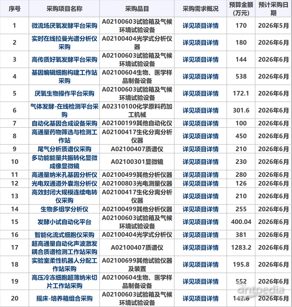近日,大連理工大學發布 2026 56月政府采購意向,涉及 20 個項目,總預算達 6326.34 萬元,預計采購日期集中于 2026 5-6 月。本次采購涵蓋微流場厭氧發酵平臺、實時在線拉曼光譜分析儀、基因編輯細胞構建工作站、超高通量自動化聲波激發耦合質譜檢測工作站等設備,涉及光學分析、質譜檢測、樣品制備、生化分離等多個品類。