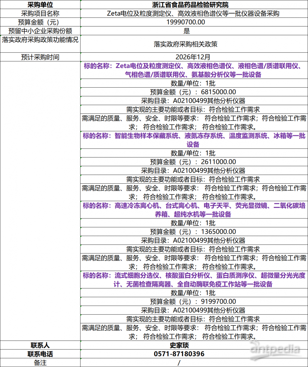 423日,浙江食藥檢院發(fā)布20266月至12月政府采購意向,擬采購AI菌落計數(shù)儀、激光粒度分析儀、X射線衍射儀、動物房專用空調機組等一批儀器設備,預算金額為822.01萬元。